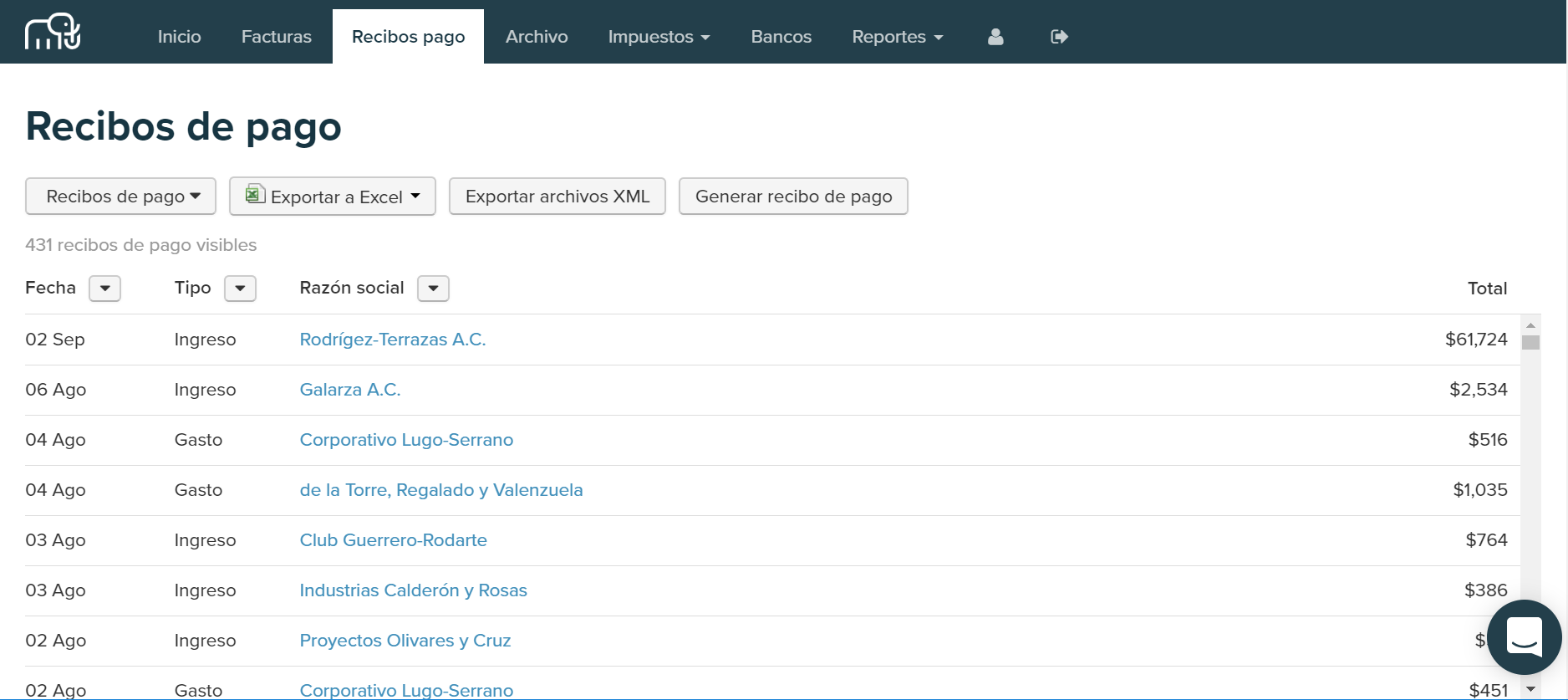 ¿Quieres saber más? Solicita tu demostración gratuitaEn la sección de recibos de pago encontrarás la descarga exclusiva de tus recibos de pago, separado de la descarga de facturas (a diferencia de otras plataformas). Aquí podrás ver si tienes recibos de ingreso o de gasto y al dar clic en alguno de ellos, se despliega el detalle de pagos así como el estatus de validación y verificación del recibo en automático.