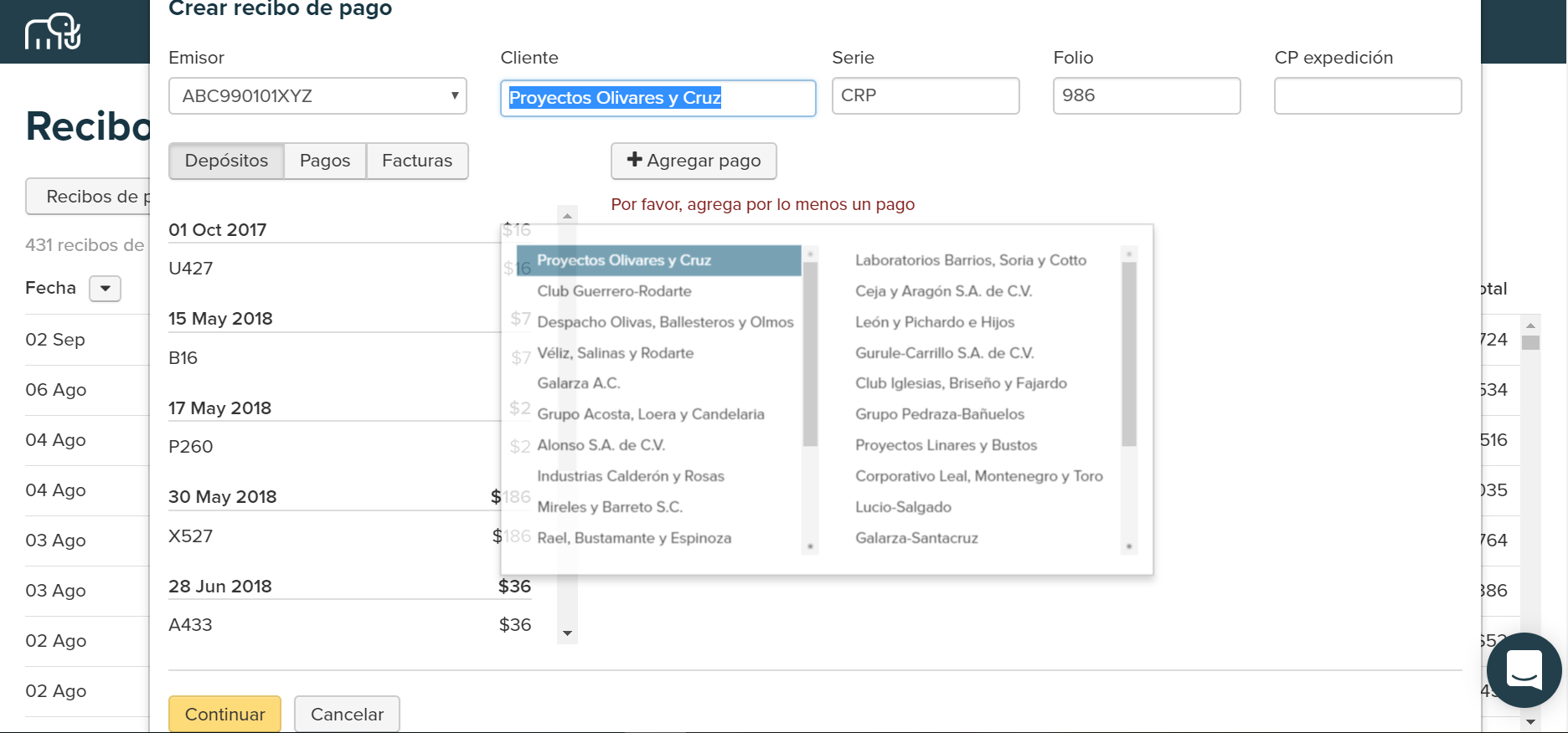 Al dar clic en generar recibo de pago, podrás seleccionar al cliente al que le quieras generar el recibo (sin necesidad de pre cargarlos) y una vez seleccionado, de lado izquierdo te aparecerán automáticamente los pagos ligados a él.