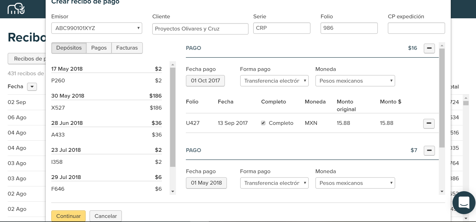 Al hacer clic en uno de los pagos, Listo de manera automática llenará la información necesaria para que emitas tu recibo como es la fecha, forma de pago y moneda. A su vez, tu podrás ligar en caso de ser necesario, múltiples facturas a un mismo pago o bien emitir recibos con parcialidades específicas.