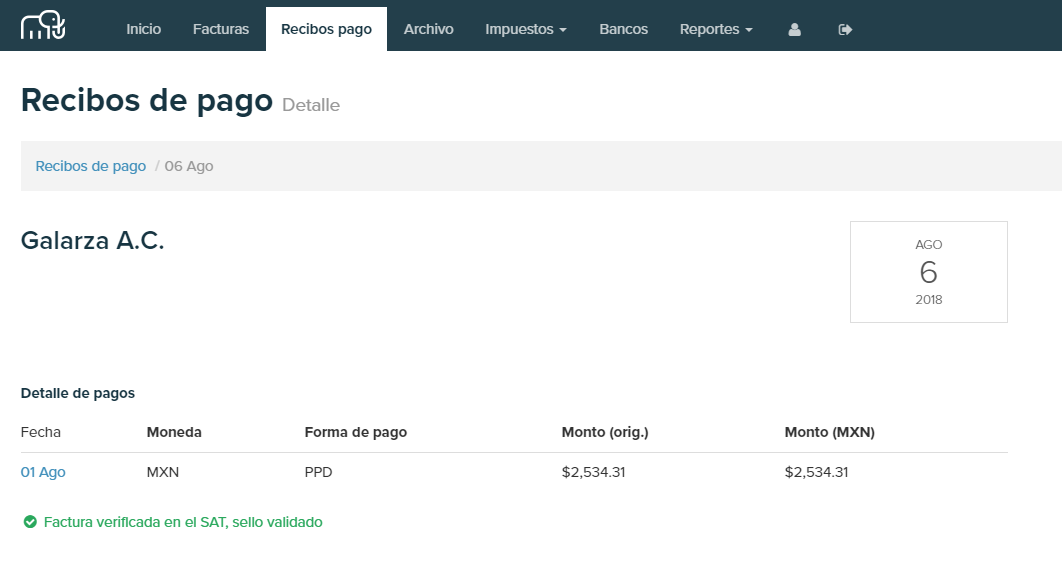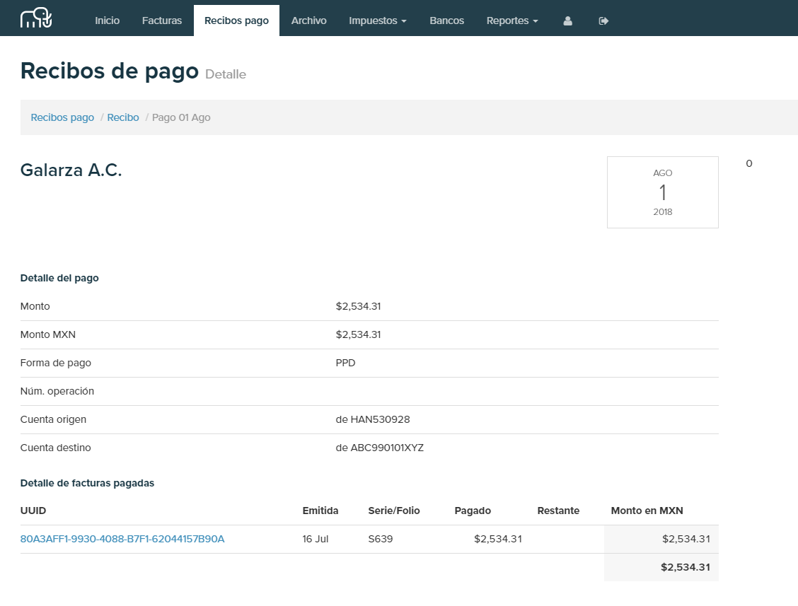 Al hacer clic en los vínculos, puedes ver la información tan a detalle como te interese. Por ejemplo aquí, al darle clic a la fecha 01 Ago, se despliega automáticamente información de montos, formas de pago y cuentas así como la factura (UUID) a la que está ligado ese recibo con su información correspondiente.