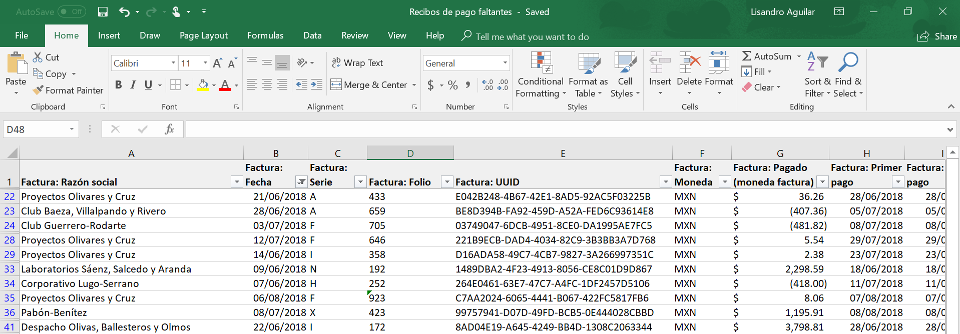 Al descargarlo, verás datos como razón social, UUID, folios y montos de las facturas a las que les falta que les emitan su recibo de pago. Con esto, buscamos que tengas un mejor control, en un par de clics y sobre todo que no tengas pérdidas económicas debido a este tipo de errores.